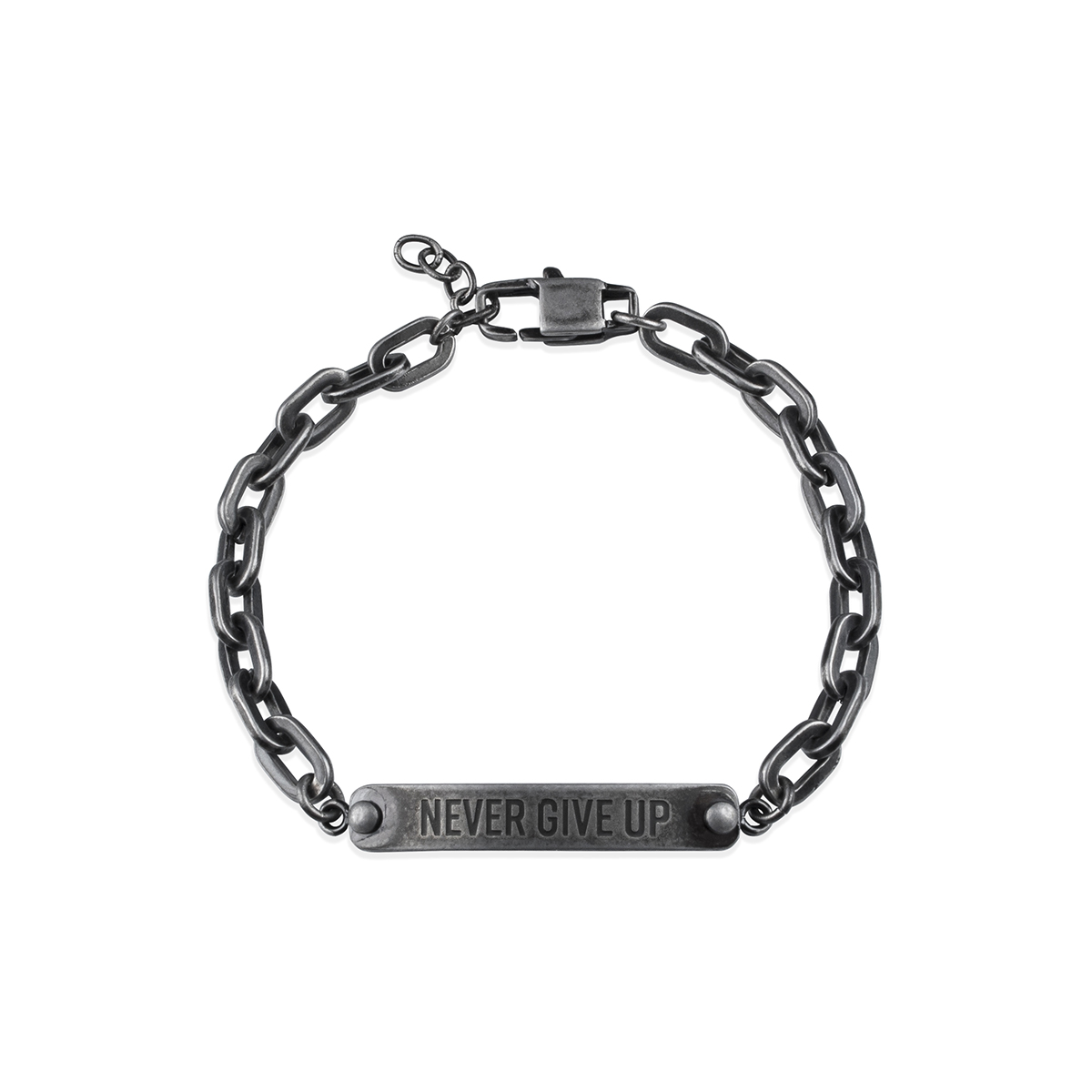 Soft steel men’s bracelet with central plate engraved with a phrase.