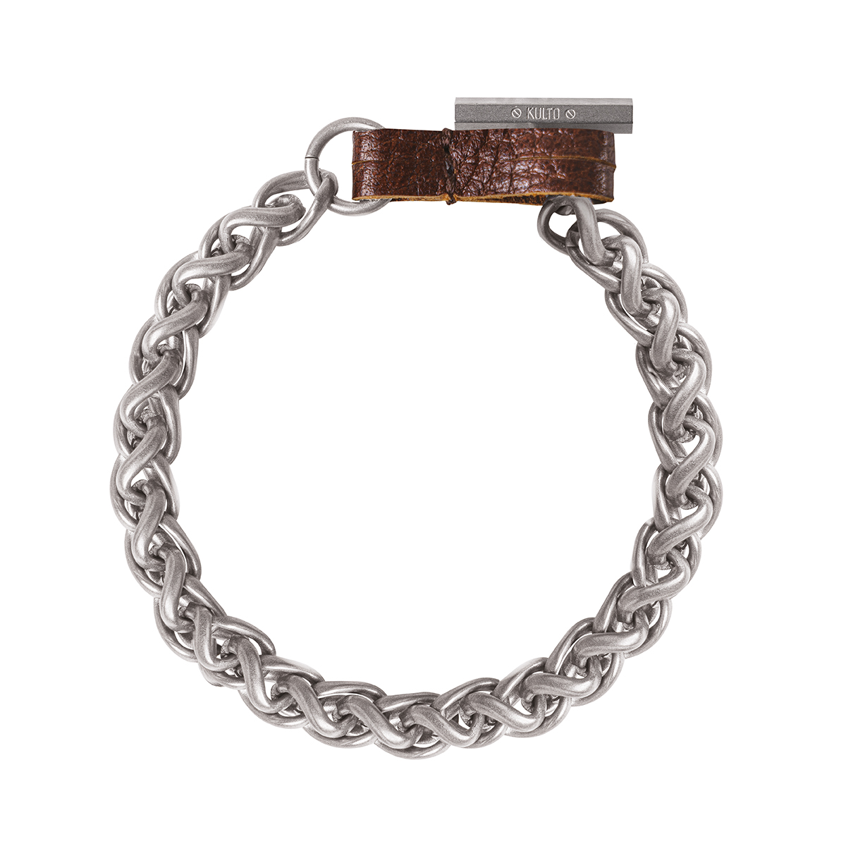 Bracciale morbido catena in acciaio con chiusura in pelle marrone e T-bar